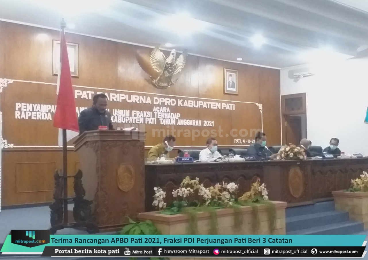 Pati, Mitrapost.com – Fraksi PDI Perjuangan di DPRD Kabupaten Pati sepakat dengan Rancangan Peraturan Daerah tentang Rancangan APBD Tahun Anggaran 2021. Namun, mereka memberikan sejumlah catatan yang harus diperhatikan oleh Pemerintah Kabupaten (Pemkab) Pati.