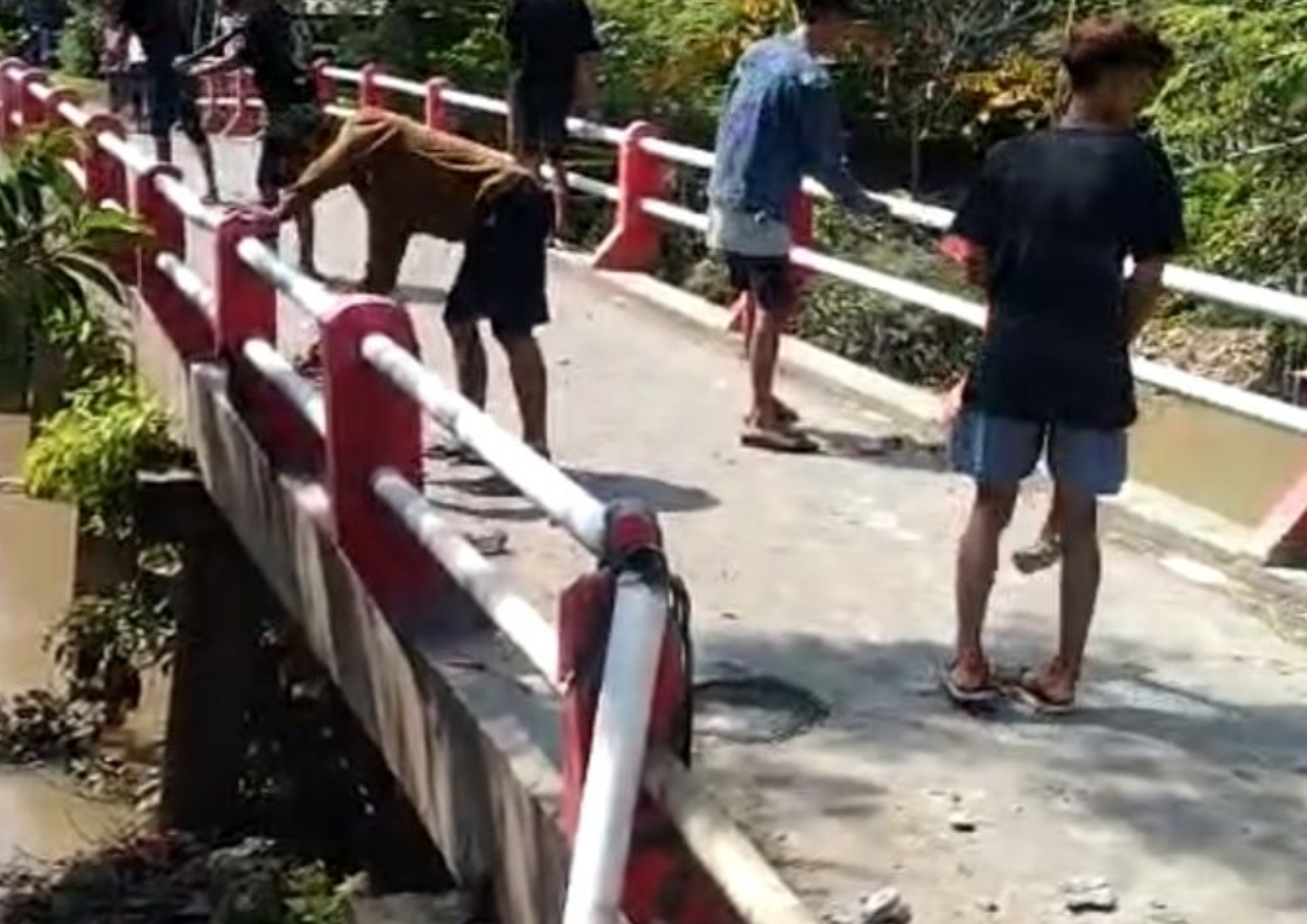 “Sehingga pada saat kejadian tadi mereka meminta izin kepada Kades dan memberikan untuk melakukan perusakan dengan cara merusak lining jembatan,” kata Winardi.