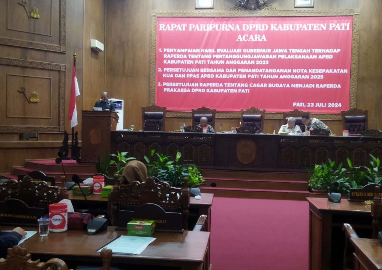 Dalam rapat paripurna tersebut, poin pertama membahas berkaitan dengan penyampaian hasil evaluasi Gubernur Jawa Tengah terhadap Raperda tentang pertanggungjawaban pelaksanaan APBD Kabupaten Pati tahun anggaran 2023, yang mana pembahasan tersebut disampaikan oleh Pj Bupati Pati, Henggar Budi Anggoro.